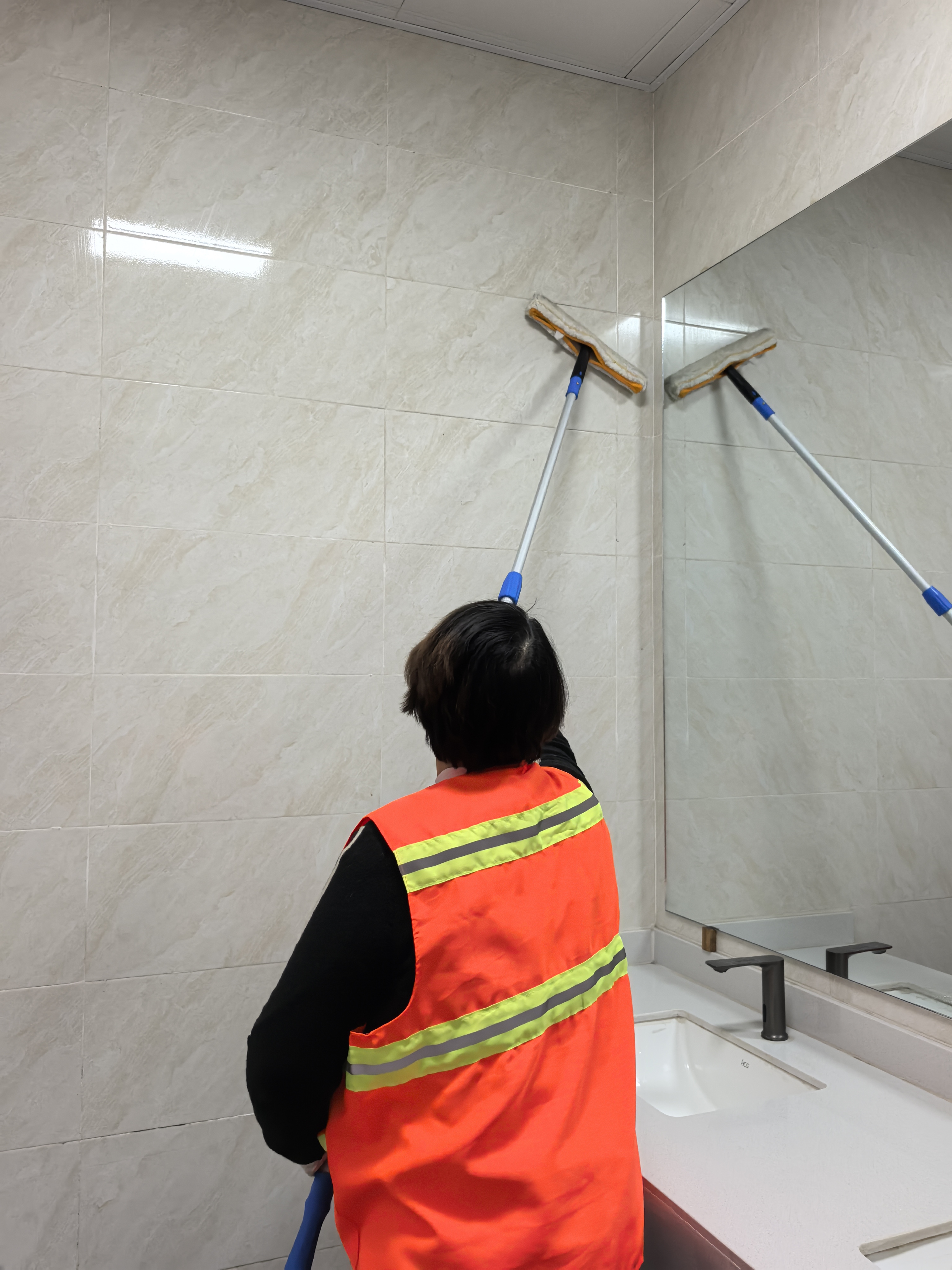 理论培训紧扣实际工作需求,推动保洁工作从“经验型”向“科学型”转变。在工具使用方面,强调对症下药。针对大面积墙面清洁,推广使用配备软质百洁垫的伸缩杆,实现高效擦洗;针对墙角、缝隙、开关面板等细节部位,配备不同颜色专用抹布与缝隙刷,严格执行工具分区、专布专用,从源头杜绝交叉污染。在作业流程上,明确“一掸、二喷、三擦、四清、五刮、六查”的标准化步骤,细化每个环节的操作要领。针对清洁难点开展专项攻坚指导,现场演示酸性清洁剂安全使用方法,重点讲解卫生间水垢、皂垢的清除技巧,同时强调操作人员个人防护与即时过水冲洗的安全规范;针对胶印、笔迹等顽固污渍,规范演示专用除胶剂与酒精的使用流程,确保在清除污渍的同时,最大限度保护墙面材质不受损伤。现场实操环节,保洁人员分组前往指定的教学楼卫生间与公共走廊区域,对照培训标准开展实战练习。经过规范化清洁作业,现场墙面光洁度显著提升,瓷砖缝隙重现洁净本色,区域整体环境焕然一新,培训效果得到直观体现。