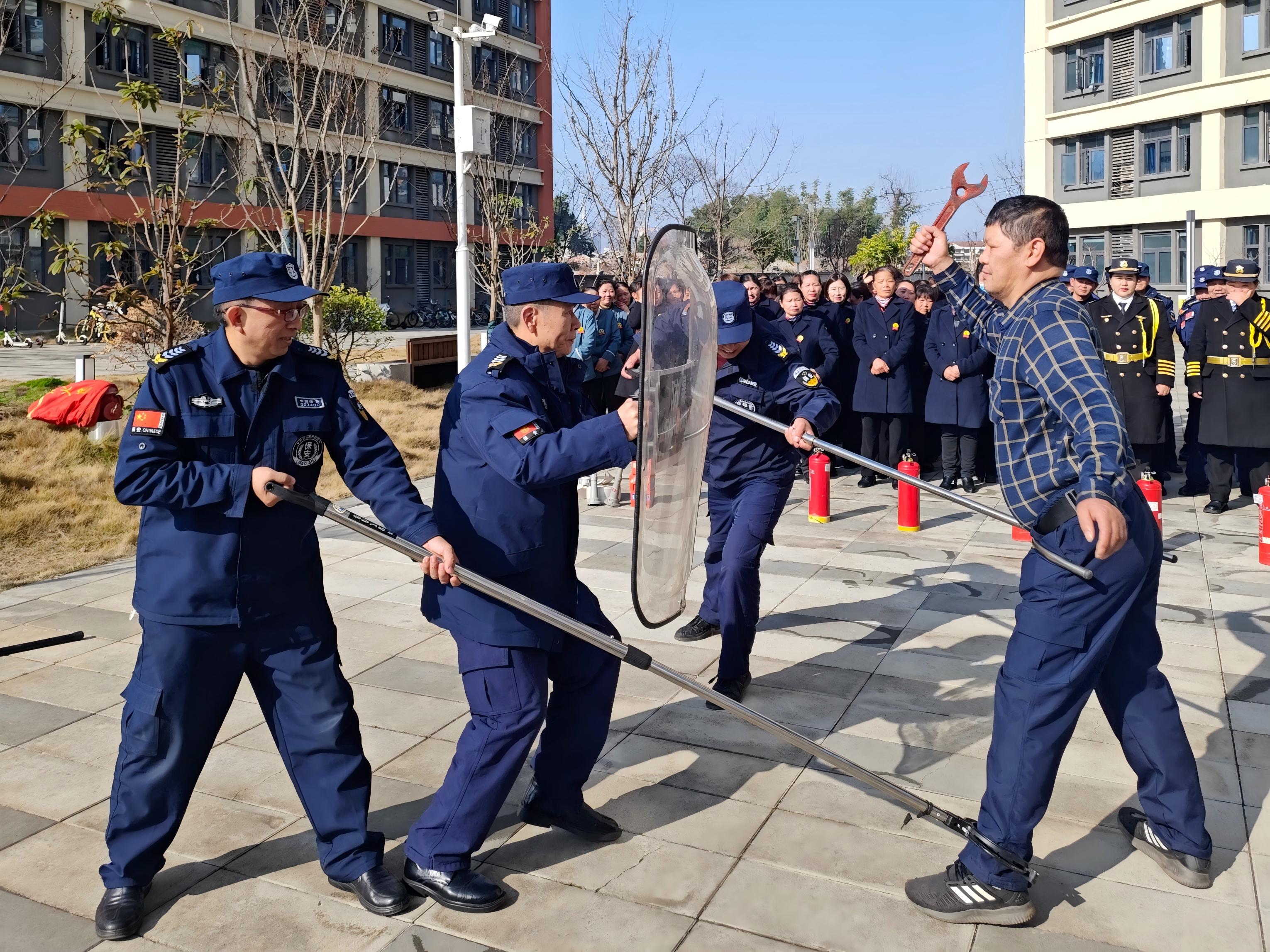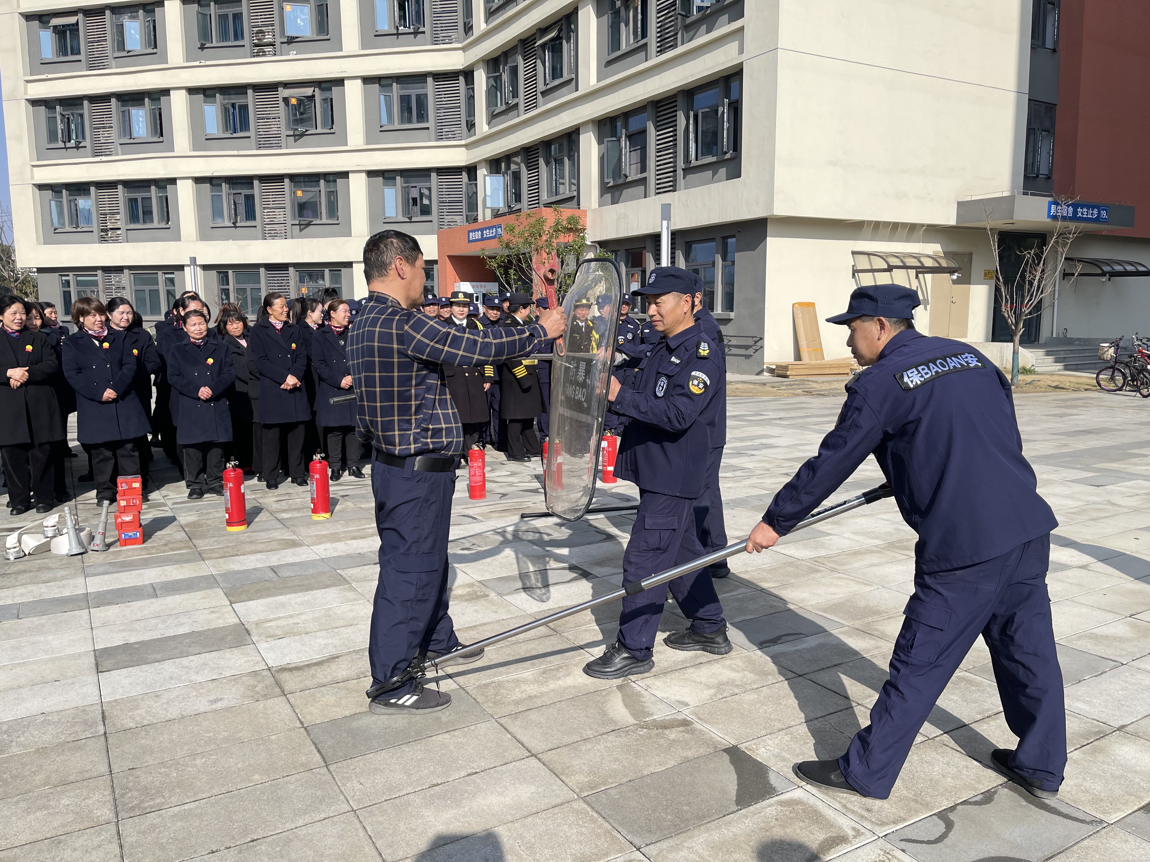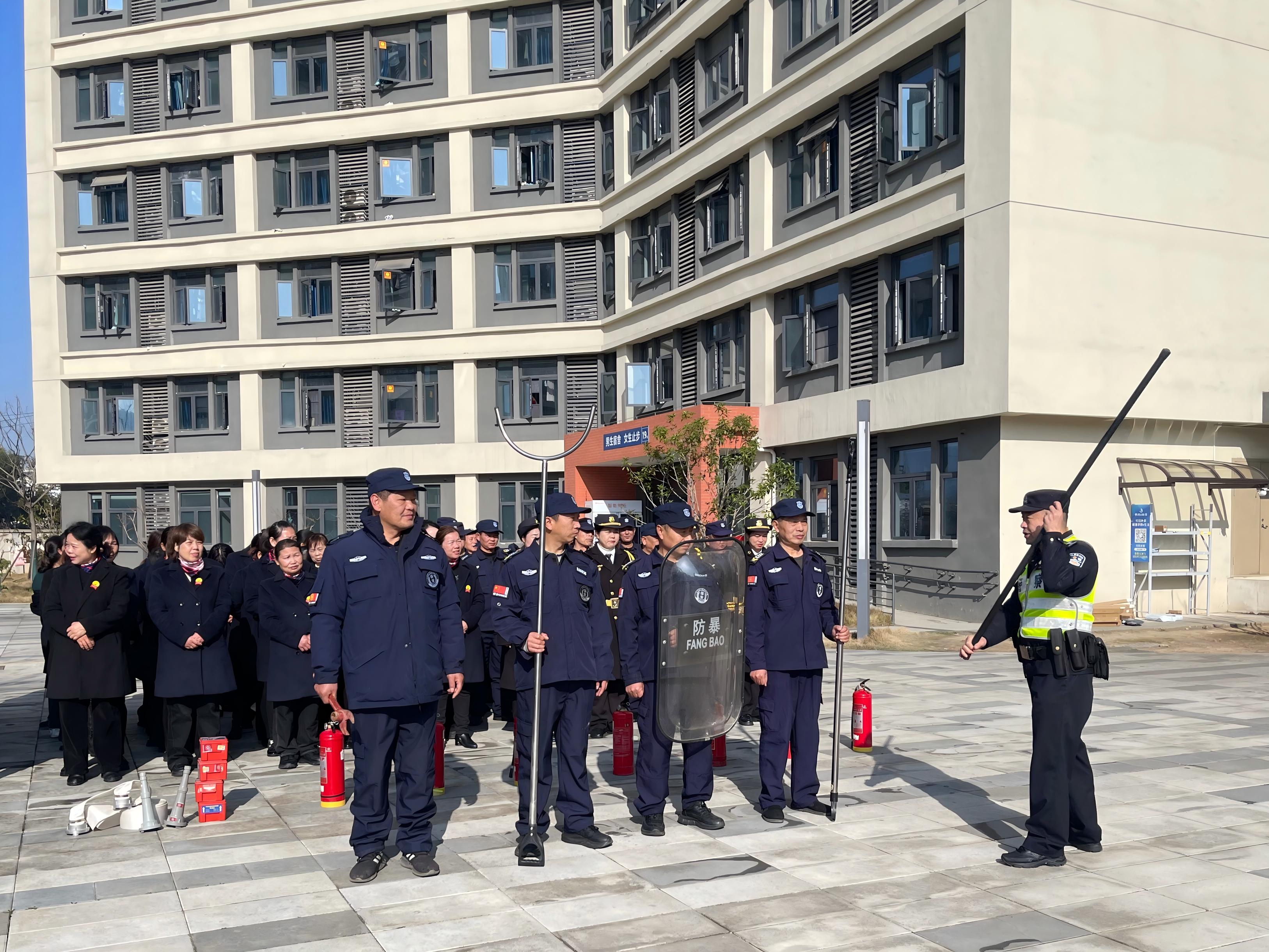 为深入贯彻落实《省教育厅关于切实抓好学校消防安全隐患整改的通知》及全省高校安全工作会议精神,进一步提升校园应急处置能力,3月11日,后勤保卫处联合武汉市公安局江夏分局纸坊街派出所在19栋学生宿舍南广场开展反恐防暴暨消防安全专项演练。学校楼宇管理员、安保人员共计80余人参与演练,以实战化训练夯实校园安全根基。