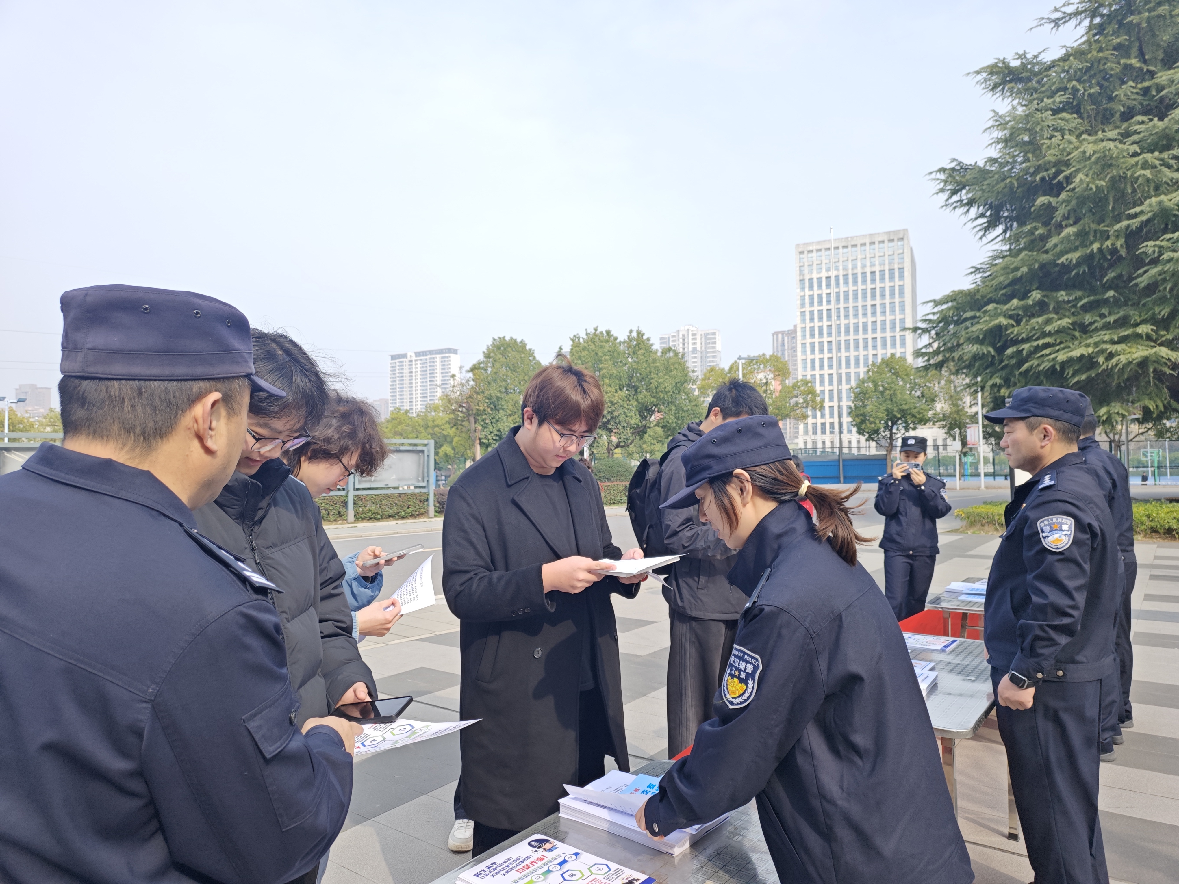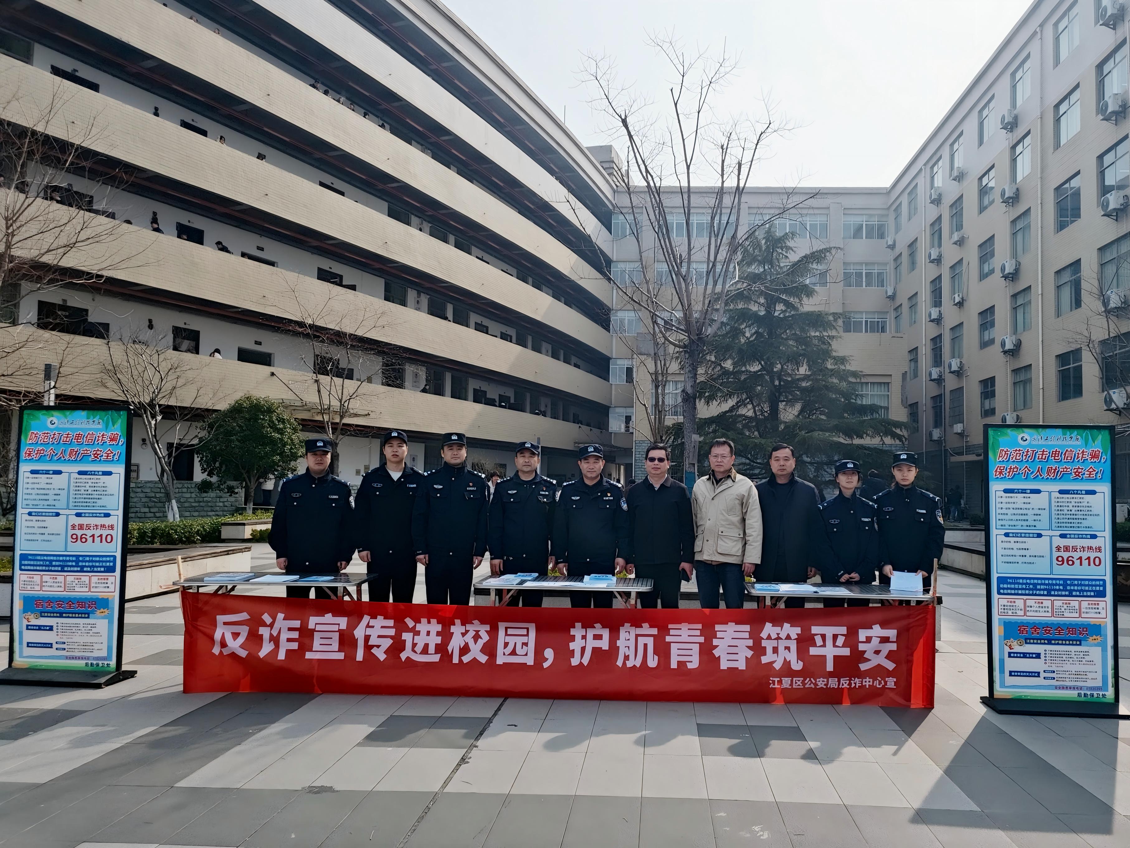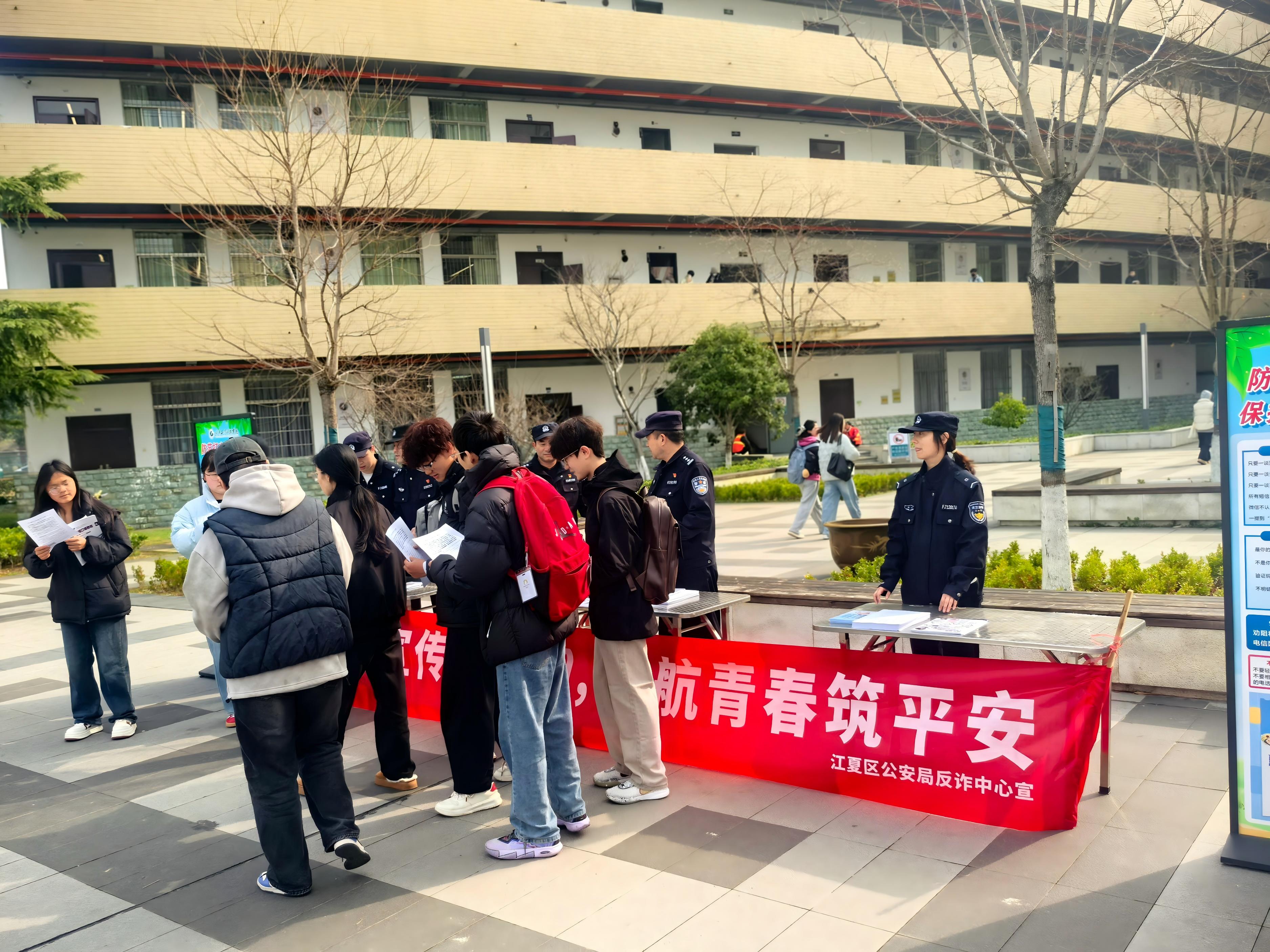 为深入贯彻落实国家关于打击治理电信网络诈骗决策部署,进一步增强师生安全防范意识和法治观念,3月5日,后勤保卫处特邀武汉市公安局江夏区分局民警及江夏戒赌所服务站工作人员走进校园,利用学生下课高峰期,在一号教学楼西广场开展“反诈防骗”专题现场宣传活动。